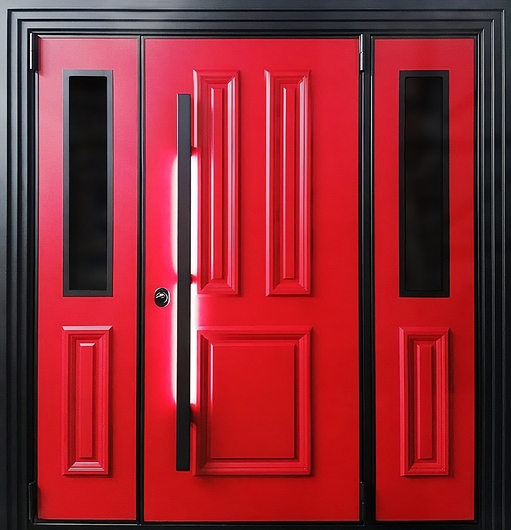 Входная остекленная группа с терморазрывом, красными панелями МДФ RAL с багетом и вертикальной ручкой КД-1185